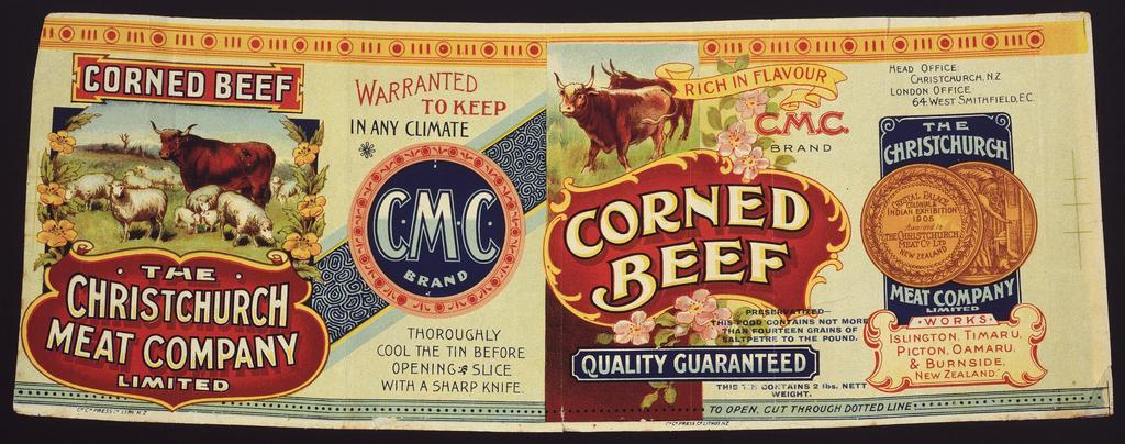 | Keywords: Shows cattle and sheep in a field in one inset panel on the left, and a picture of two bulls at the top centre. Medals show the award won by the company at the Crystal Palace Colonial & Indian Exhibition in 1905. Decorative lettering and panels are used. Quantity: 1 colour art print(s). Physical Description: Chromolithograph, on label, 127 x 337 mm. Provenance: Donated loose in the back of the Gear Meat Company scrapbook. Christchurch Press Company Ltd. Christchurch Meat Company Limited :Corned beef, quality guaranteed. Ch[rist]ch[urch] Press Co Litho's, N.Z. [1906-1920?]. Ref: Eph-C-MEAT-1900s-04. Alexander Turnbull Library, Wellington, New Zealand. natlib.govt.nz/records/23048278 Shows cattle and sheep in a field in one inset panel on the left, and a picture of two bulls at the top centre. Medals show the award won by the company at the Crystal Palace Colonial & Indian Exhibition in 1905. Decorative lettering and panels are used. Quantity: 1 colour art print(s). Physical Description: Chromolithograph, on label, 127 x 337 mm. Provenance: Donated loose in the back of the Gear Meat Company scrapbook. Christchurch Press Company Ltd. Christchurch Meat Company Limited :Corned beef, quality guaranteed. Ch[rist]ch[urch] Press Co Litho's, N.Z. [1906-1920?]. Ref: Eph-C-MEAT-1900s-04. Alexander Turnbull Library, Wellington, New Zealand. natlib.govt.nz/records/23048278 |