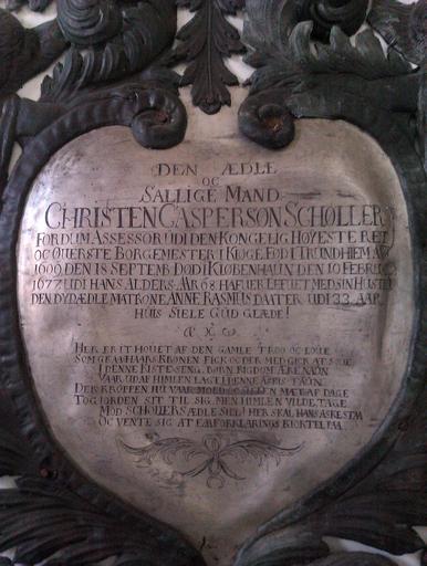 | Keywords: Christen Caspersøn Schøller (Sankt Nicolai Kirke i Køge).jpg DEN ÆDLE OC SALLIGE MAND CHRISTEN CASPERSØN SCHØLLER FORDUM ASSESSOR à DI DEN KONGELIG HØYESTE RET OC ØUERSTE BORGEMESTER I KIØGE FØD I TRUNDHIEM ANNO 1609 DEN 18 SEPTEMB DØD I KIØBENHAUN DEN 10 FEBRUAR 1677 UDI HANS ALDERS AAR 68 HAFFUER LEFUET MED SIN HUSTRU DEN DYDÆDLE MATRONE ANNE RASMUSDAATER UDI 33 AAR HUIS SIELE GUD GLÆDE own 2012-10 Orf3us Køge Kirke PD-old-100 | ||||