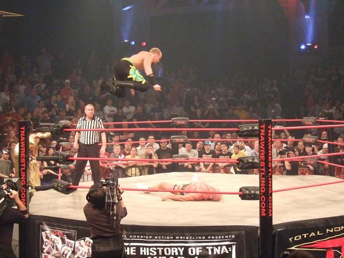 Keywords: Christian Cage Frog Splash.jpg en Christian Cage Performing His Signature Frog Splash on Kurt Angle Own Peepzilla Jason Reso Kurt Angle Professional wrestling aerial techniques Total Nonstop Action Wrestling