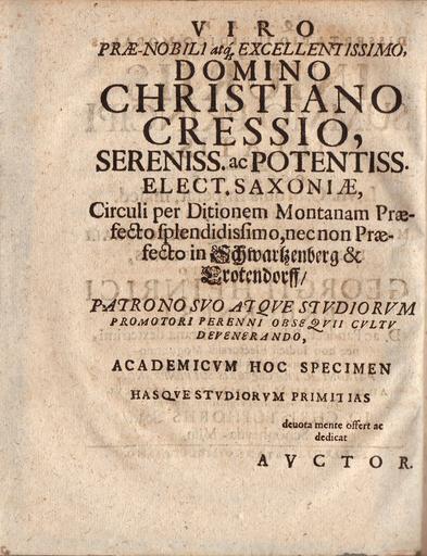 Keywords: Christian Kreß.jpg kurfürstlicher Amtmann des Kreisamts Schwarzenberg Er wird in der im Jahr 1696 erschienen Dissertation des ersten Schönheider Pfarrers Johann Christpoh Vogel als Widmungsträger erwähnt Sein Name ist in latinisierter Form Christianus Cressius geschrieben hier im Dativ own Klaaschwotzer 2014-06-27 Schwarzenberg/Erzgeb Christian Kreß Amtmann Cc-zero |
