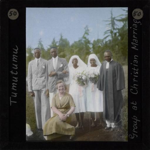 Keywords: Christian Marriage, Tumutumu, Kenya, ca.1905-ca.1940 (imp-cswc-GB-237-CSWC47-LS7-050).jpg en <br> Christian Marriage Tumutumu Kenya ca 1905-ca 1940 Group at Christian Marriage Tumutumu Photograph of a Christian Marriage in the missionary station of Tumutumu In the photograph are two women dressed in white two men dressed in suits and a pastor A missionary is sitting at the front of the group ; This belongs to a series of Church of Scotland Foreign Missions Committee lantern slides relating to the Kikuyu Mission in Kenya which was set up by Church of Scotland missionaries Hospitals were established by Scottish missionaries in Kikuyu in 1908 in Tumutumu in 1909 and in Chogoria in 1922 The missionaries also introduced the Presbyterian Church to the area The Kikuyu are Kenya's most populous ethnic group Photographer Unknown Filename imp-cswc-GB-237-CSWC47-LS7-050 tif Coverage date 1905/1940 Part of collection International Mission Photography Archive ca 1860-ca 1960 Type images Part of subcollection Photographs from the Centre for the Study of World Christianity University of Edinburgh U K ca 1900-ca 1940s Repository name Centre for the Study of World Christianity Archival file impaunpub_Volume7/1656 url Repository address The University of Edinburgh School of Divinity New College Mound Place Edinburgh EH1 2LX United Kingdom Geographic subject country Kenya Format aacr2 1 lantern slide 8 x 8 cm Geographic subject continent Africa Rights Contact the repository for details Part of series Kenya Mission LS7 Repository email divinity-CSWC ed ac uk Subject lcsh Keyword Marriage; Rites and ceremonies; Religious gatherings Date created 1905/1940 Publisher of the digital version University of Southern California Libraries Subject aat genre group portraits Format aat lantern slides Legacy record ID impa-m68763 Access conditions http //www ed ac uk/schools-departments/divinity/research/centres/world-christianity/collections-resources File GB 237 CSWC47/LS7/50 1905/1940 author http //digitallibrary usc edu/cdm/ref/collection/p15799coll123/id/64776 PD-old-70-1923 Magic lantern images Images from USC Digital Library uploaded by Fæ International Mission Photography Archive ca 1860-ca 1960 |
