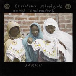 | Keywords: Christian School Girls embroidering cloth, Jammu, ca.1875-ca.1940 (imp-cswc-GB-237-CSWC47-LS10-050).jpg en <br> Christian School Girls embroidering cloth Jammu ca 1875-ca 1940 Photograph of 3 young Indian Christian school girls doing embroidery The girls are embroidering colourful floral patterns onto white cloth ; This belongs to a series of Church of Scotland Foreign Missions Committee lantern slides relating to Jammu City which is also known as the City of Temples A mission station occupied by Church of Scotland missionaries was founded here in the late 19th/early 20th century Jammu is also one of the three administrative divisions within Jammu and Kashmir the northernmost state in India Photographer Unknown Filename imp-cswc-GB-237-CSWC47-LS10-050 tif Coverage date 1875/1940 Part of collection International Mission Photography Archive ca 1860-ca 1960 Geographic subject region Jammu and Kashmir Type images Part of subcollection Photographs from the Centre for the Study of World Christianity University of Edinburgh U K ca 1900-ca 1940s Repository name Centre for the Study of World Christianity Archival file impaunpub_Volume7/1767 url Repository address The University of Edinburgh School of Divinity New College Mound Place Edinburgh EH1 2LX United Kingdom Geographic subject country India Format aacr2 1 lantern slide 8 x 8 cm Geographic subject continent Asia Rights Contact the repository for details Part of series In the Temple City of Jammu LS10 Repository email divinity-CSWC ed ac uk Subject lcsh Keyword Religious education; Embroidery; Children Date created 1875/1940 Publisher of the digital version University of Southern California Libraries Subject aat genre group portraits Format aat lantern slides Legacy record ID impa-m69318 Access conditions http //www ed ac uk/schools-departments/divinity/research/centres/world-christianity/collections-resources File GB 237 CSWC47/LS10/50 1875/1940 author http //digitallibrary usc edu/cdm/ref/collection/p15799coll123/id/64884 PD-old-70-1923 Magic lantern images Images from USC Digital Library uploaded by Fæ International Mission Photography Archive ca 1860-ca 1960 People of Jammu |