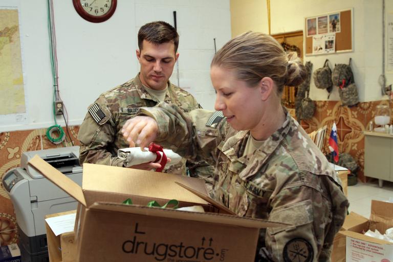 Keywords: Christmas Eve cookout and soccer tournament on FOB Farah 121224-N-IE116-005.jpg en U S Navy Lt j g Laura Cook right physician assistant for Provincial Reconstruction Team PRT Farah presents a Christmas gift to U S Navy Intelligence Specialist 1st Class Daniel Baudin a member of the PRT's intelligence team on Christmas Eve Dec 24 PRT Farah's mission is to train advise and assist Afghan government leaders at the municipal district and provincial levels in Farah Province Afghanistan Their civil military team is comprised of members of the U S Navy U S Army the U S Department of State and the Agency for International Development USAID U S Navy photo by HMC Josh Ives/released <br>Unit Provincial Reconstruction Team Farah 2012-12-24 Chief Petty Officer Joshua Ives https //www dvidshub net/image/806058/christmas-eve-cookout-and-soccer-tournament-fob-farah 121224-N-IE116-005 2012-12-24 11 46 FORWARD OPERATING BASE FARAH AF PD-USGov-Military-Navy Forward Operating Base Farah Images from DoD uploaded by Fæ |