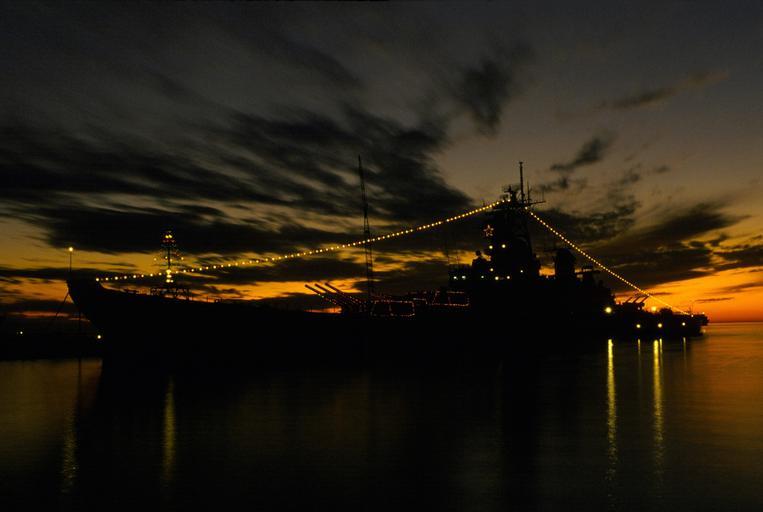 Keywords: christmas lights decoration navy ship pier dusk harbor bright reflection water uss iowa usa winter seasonal decorative