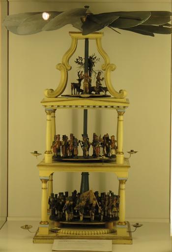 Keywords: Christmas pyramid from about 1830.jpg en Old Christmas pyramid from about 1830 - first half of the 19 century From Germany Ore Mountains Ore Mountain folk art crafted at Schoenheide in the Ore Mountains Now to be seen in the Brush- and regional Museum at Schoenheide/Saxony de Weihnachtspyramide im Bürsten- und Heimatmuseum Schönheide/Erzgebirge - Text der Beschriftung im Museum um 1830 gehört zu den ältesten erhaltenen Pyramiden des Erzgebirges Ca 60 geschnitzte Figuren Erste Etage Bergaufzug und Handwerker Zweite Etage Darstellung der biblischen Weihnachtsgeschichte Maria und Josef auf der Flucht nach Ägypten Engel Soldaten Schriftgelehrter ¦ Dritte Etage Paradiesgärtlein mit Adam und Eva Baum mit Schlange exotischen Tieren Der 24 Dezember galt lange Zeit als Adam-und-Eva-Tag žDer klassische Drehturm aus Schönheide mit seiner Barockbekrönung mag auf die Zeit um 1830 zurückgehen Adolf Spamer Deutsche Volkskunst Sachsen Weimar 1954 žÃ„lteste geschnitzte Figuren des Bergaufzugs sind auf Pyramiden aus der ersten Hälfte des vergangenen Jahrhunderts gemeint ist das 19 Jahrhundert erhalten Claus Leichsenring Erzgebirgische Weihnachtspyramiden 1993 own Klaaschwotzer 2013-12-01 Christmas pyramids in Germany Ore Mountain folk art Christmas pyramids Christmas pyramid from about 1830 Cc-zero |