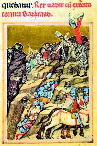 | Keywords: Chronicon Pictum P0143 A posadai csata1.JPG author The w Battle of Posada in the The w Battle of Posada November 9-12 1330 in the Chronicon Pictum The Basarab I of Wallachia 's army ambushed Charles Robert of Anjou king of Hungary and his 30 000-strong invading army The Vlach Romanian warriors rolled down rocks over the cliff edges in a place where the Hungarian mounted knights could not escape from them nor climb the heights to dislodge the attackers Huida de Carlos Roberto en la batalla de Posada tras ser derrotado por el Príncipe de Valaquia Crónica Ilustrada húngara La bataille de Posada 1330 à la suite de laquelle la Hongrie dut reconnaître l'indépendance de la Valachie Chronique enluminée de Vienne bataille de Posada La belle image L'armée du roi de Hongrie Charles d'Anjou prise dans une embuscade tendue par Basarab Ier de Valachie Enluminure du Chronicon Pictum ציור בכרוניקה המצוירת בווינה ע קרב פוסאדה Bečka oslikana kronika Bitka kod Posade A posadai csata A posadai csata a Képes krónikában Csór Tamás átadja lovát Károly Róbert királynak サ の戦い 14世 ハンガリーの年代記クロニコン・ピクトゥムより De Slag bij Posada Chronicon Pictum Vindobonense - Slag bij Posada Bitwa pod Posadą Średniowieczne przedstawienie bitwy pod Posadą Armia Karola Roberta zaskoczona w wąwozie pod Posadą Carlos I da Hungria Bătălia de la Posada din 1330 în Cronica pictată de la Viena Potrivit ipotezei lui Matei Cazacu Basarab ar putea fi personajul din stânga cu un bolovan în mâini Битка код Посада 1320 1360 Viyana Kroniklerinde Posada Savaşı Битва п и Посаді 1330 1358 Institution National Széchényi Library accession number 404 object history credit line photo taken by uploader User Csanády Same book <gallery> File Chronicon Pictum P0146 A posadai csata2 JPG Other version of this picture in Chronicon Pictum p 146 </gallery> <gallery> File Viennese Illuminated Chronicle Posada jpg File Battle1330 jpg </gallery> PD-Art-100 Battle of Posada Chronicon Pictum Basarab I of Wallachia in miniature Charles I of Hungary Swords of Hungary Warriors in art Death in paintings Archers in art Bow and arrow in art Equestrian portrait paintings Cavalry of Hungary Medieval miniatures of battles Killing in medieval miniature Swords of Romania |