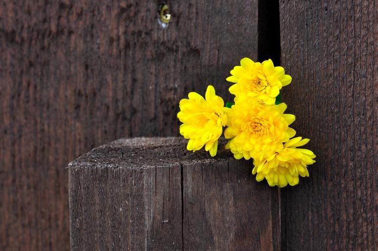 Keywords: chrysanthemums flowers yellow wood fence macro background brown