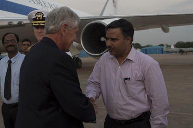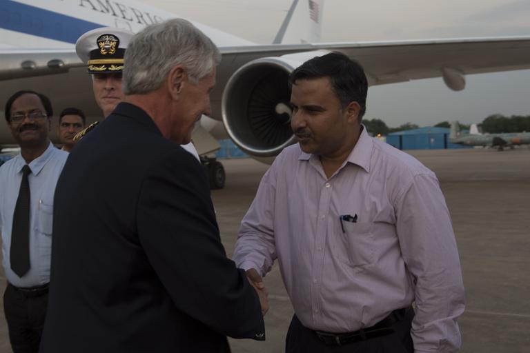 | Keywords: Chuck Hagel greeted by officials at IGI Airport 6.jpg New Delhi India Aug 7 2014 -- Secretary of Defense Chuck Hagel is greeted by senior U S and Indian Defense officials at Indira Gandhi International Airport in New Delhi India August 7 2014 DoD photo by Petty Officer 2nd Class Sean Hurt/Released https //www flickr com/photos/secdef/14669700879/ 140807-N-AF077-252 2014-08-07 09 40 https //www flickr com/people/68842444 N03 Ash Carter PD-USGov Secretary of Defense https //flickr com/photos/68842444 N03/14669700879 2015-12-11 09 50 39 United States Government Work Chuck Hagel in India 2014 at Indira Gandhi International Airport |