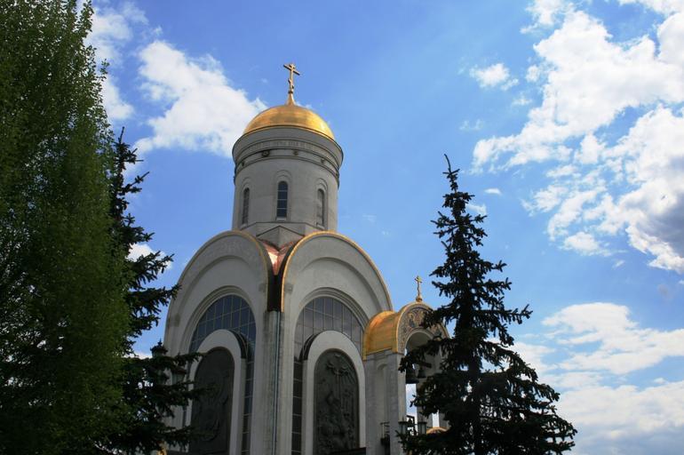 Keywords: church russian orthodox building commemorative high arches golden cupola dome gilt ornate glass panes relief work sky trees