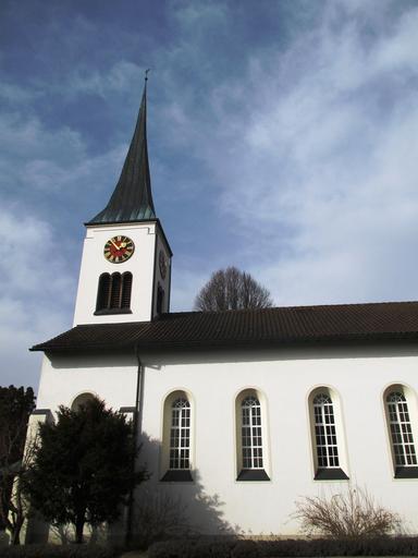 Keywords: church tower hauptwil clock tower architecture facade window trees sky thurgau switzerland