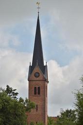Keywords: church wide angle steeple clouds sky covered sky dramatic mood