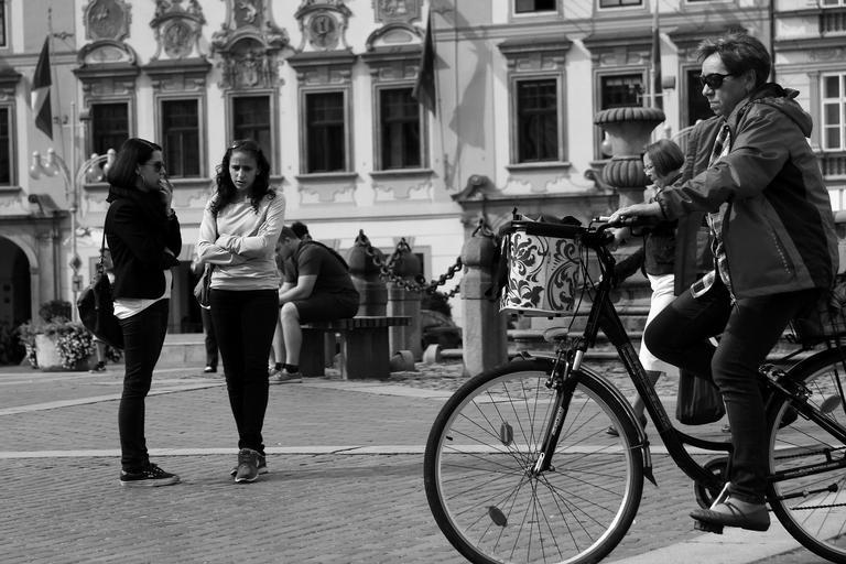Keywords: ciclista round square czech budejovice black and white girls woman fountain paving characters old building city center south bohemia building city bohemia