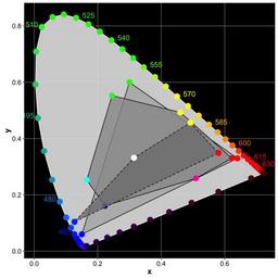 | Keywords: CIE xyY Chromaticity Diagram With Embedded Gamuts.png en This is the standard CIE xyY chromaticity diagram that shows embedded gamuts representing in embedded order physical primaries defined by sRGB color the FOGRA39 CMY/RGB data http //www color org/FOGRA39 txt and converted CIE Lab coordinates for ultramarine blue cadmium red and yellow ochre https //people csail mit edu/jaffer/Color/winsor-newton-lab txt the dashed lines of the innermost triangle representing these pigments indicates that the gamut as shown is not precise due to multiple physical effects involved in pigment mixing The R source for generating this graph is available at https //github com/mittimithai/colorspacegraphs 2016-11-09 own Maneesh other versions cc-zero Color vision |