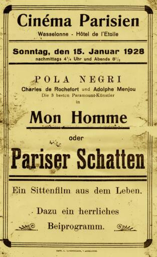 | Keywords: Cinéma Parisien Wasselonne 1928.png fr Wasselonne Cinéma Parisien Affiche de la première séance le 15 janvier 1928 1928-01 Coll Frédéric Brommvorst Wasselonne Imprimerie Rosenfelder Wasselonne Typographie de 1928 PD-old Wasselonne Pola Negri Movie posters of France |