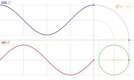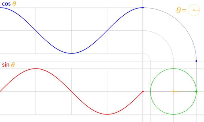 Keywords: Circle cos sin.gif en We have the unit circle with radius 1 in green placed at the origin at the bottom right In the middle of this circle in yellow is represented the angle theta θ This angle is the amount of counter-clockwise rotation around the circle starting from the right on the x-axis as illustrated An exact copy of this little angle is shown at the top right as a visual illustration of the definition of θ At this angle and starting at the origin a faint green line is traced outwards radially This line intersects the unit circle at a single point which is the green point spinning around at a constant rate as the angle θ changes also at a constant rate The vertical position of this point is projected straight along the faint red line onto the graph on the left of the circle This results in the red point The y-coordinate of this red point the same as the y-coordinate of the green point is the value of the sine function evaluated at the angle θ that is y coordinate of green point sin θ As the angle θ changes the red point moves up and down tracing the red graph This is the graph for the sine function The faint vertical lines seen passing to the left are marking every quadrant along the circle that is at every angle of 90° or Ï /2 radians Notice how the sine curve goes from 1 to zero to -1 then back to zero at exactly these lines This is reflecting the fact sin 0 0 sin Ï /2 1 sin Ï 0 and sin 3Ï / 2 -1 A similar process is done with the x-coordinate of the green point However since the x-coordinate is tilted from the usual convention to plot graphs where y f x with y vertical and x horizontal an untilt operation was performed in order to repeat the process again in the same orientation instead of vertically This was represented by a bend seen on the top right Again the green point is projected upwards along the faint blue line and this bent projection ends up in the top graph ™s rightmost edge at the blue point The y-coordinate of this blue point which due to the bend in the projection is the same as the x-coordinate of the green point is the value of the cosine function evaluated at the angle θ that is x coordinate of green point cos θ The blue curve traced by this point as it moves up and down with changing θ is the the graph of the cosine function Notice again how it behaves at it crosses every quadrant reflecting the fact cos 0 1 cos Ï /2 0 cos Ï -1 and cos 3Ï /2 0 own LucasVB 2014-03-16 Trigonometry Trigonometric functions Sine function Cosine function Mathematical animations |
