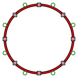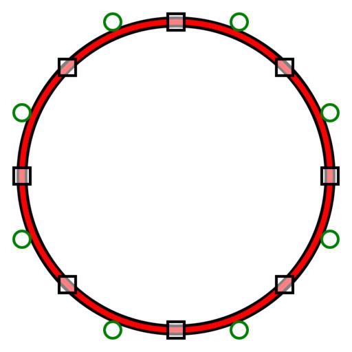 | Keywords: Circle and quadratic bezier.svg Bézier spline approximation in red overlayed on a black circle of radius 112 units with tangent on-curve control points drawn as squares and off-curve control points drawn as circles The spline's on-curve control points are placed at the circle's horizontal and vertical tangent points and at displacements 79 79 from the center and its reflections about the X and Y axes Off-curve control points are placed at the intersections between the horizontal and vertical tangent line and 45-degree lines from the diagonal control points own Damian Yerrick 2009-10-15 Circle geometry Typographic software Splines |