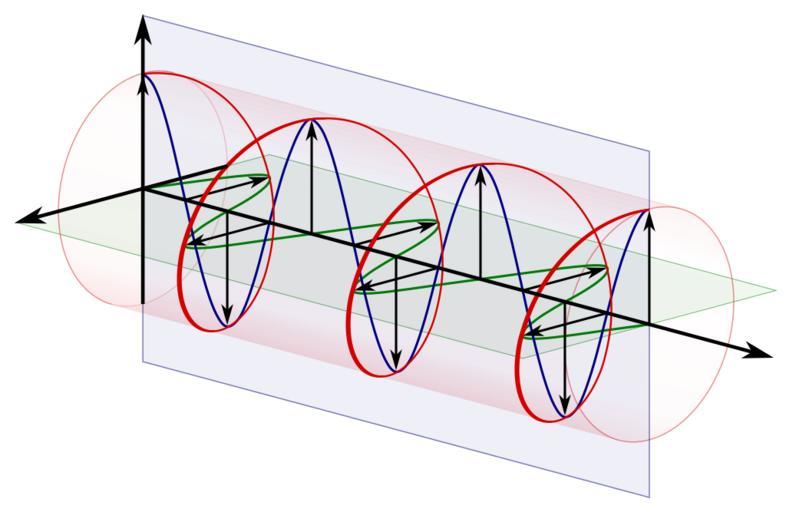 | Keywords: Circular.Polarization.Circularly.Polarized.Light With.Components Left.Handed.svg Circular polarization Handedness conventions for clarification The horizontal component and its corresponding plane are illustrated in green while the vertical component and its corresponding plane are illustrated in blue Given that this is left-handed circularly polarized light the leftward relative to the direction of travel horizontal component leads the vertical component by one quarter of a wavelength This phase quadrature results in the points of maximum magnitude for the vertical component corresponding to the points of zero magnitude for the horizontal component and visa versa The result is that there are select vectors corresponding to the helix which exactly match the maximums of the vertical and horizontal components To minimize visual clutter these are the only helix vectors displayed ---- This image was created using the open source program Inkscape If you open it using that program the image will still be divided into layers and you will have access to information used to create it If you need to alter it I would suggest first going to my Wikimedia User page at Dave3457 where information is gathered and other related images are listed Created with Inkscape own Dave3457 polarisation Circular and elliptical polarization |