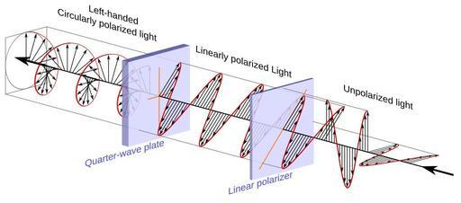 | Keywords: Circular.Polarization.Circularly.Polarized.Light Circular.Polarizer Creating.Left.Handed.Helix.View.svg  Refer here The transmission axis of the linear polarizer represented with an orange line is at a positive 45° angle On the quarter-wave plate also represented in orange is the horizontal slow axis and the vertical fast axis In this instance the unpolarized light entering the linear polarizer is displayed as a single wave whose linear polarization is suddenly changing its angle and magnitude When one attempts to pass unpolarized light through the linear polarizer only light that has its electric field at the positive 45° angle leaves the linear polarizer and enters the quarter-wave plate To understand the effect the quarter-wave plate has on the linearly polarized light it is useful think of the light being divided into two components at right angles orthogonal Toward this end the crossed orange lines are projections of the red line onto the vertical and horizontal planes respectively and represent the amplitude of the wave on those two planes In linearly-polarized light the two components are in phase Because the quarter-wave plate is made of a birefringent material when in the wave plate the light travels at different speeds depending on the direction of its electric field This means that the horizontal component which is along the slow axis of the wave plate will travel at a slightly slower speed than the component that is directed along the vertical fast axis Initially the two components are in phase but as the two components travel through the wave plate the horizontal component of the light drifts farther behind that of the vertical By adjusting the thickness of the wave plate one can control how much the horizontal component is delayed relative to vertical component before the light leaves the wave plate and they again begin to travel at the same speed When the light leaves the quarter-wave plate the rightward horizontal component will be exactly one quarter of a wavelength behind the vertical component making the light left hand circularly polarized ---- This image was created using the open source program Inkscape If you open it using that program the image will still be divided into layers and you will have access to information used to create it If you need to alter it I would suggest first going to my Wikimedia User page at Dave3457 where information is gathered and other related images are listed Created with Inkscape own Dave3457 thumb left 100px Greek thumb left 100px Russian Translation possible Polarization filters |