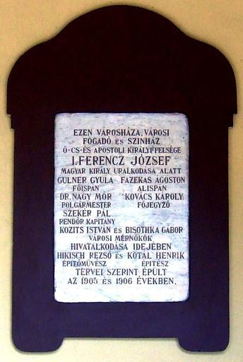 | Keywords: City-hall plaque in Kiskunhalas.jpg  en Commemorative plaque to the costruction of the large ensemble of town hall hostel and theater in Kiskunhalas in 1906 It is placed near entrance of the town hall Kiskunhalas HÅ‘sök Square Nr 1 derivative work fr Plaque commémorative à la construction du grand ensemble du hôtel de ville auberge et théâtre à Kiskunhalas en 1906 Elle est apposée près de l ™entrée du hôtel de ville 1 place HÅ‘sök Kiskunhalas oeuvre dérivée hu A kiskunhalasi városháza-fogadó-szÃnház épületegyüttes 1906-os épÃtésének emléktáblája a városháza bejáratánál Kiskunhalas HÅ‘sök tere 1 másodlagos munka 2005-01-13 16 48 20 Cropped from http //commons wikimedia org/wiki/File Kiskunhalas_városháza_emléktábla JPG Original uploader was Csanády 46 25 49 50 N 19 28 41 40 E DEFAULTSORT Town hall cc-zero Uploaded with UploadWizard Kiskunhalas Town Hall Plaques in Kiskunhalas |