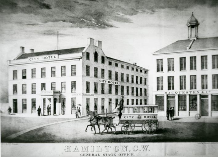 Keywords: hamilton hamont architecture building outdoor City Hotel was at 55 James Street North and had been built in 1845. By the early 1850s it was the best hotel in Hamilton. The proprietor was Thomas Davidson and he boasted that his “bar was furnished with wines, spirits and every description of liquors of the most recherché class, and a choice assortment of cigars, of various brands” also that “a large and commodious stable was on the premises.” Mr. Davidson later opened the Royal Hotel [more on that shortly] before leaving Hamilton for Cuba where he died in December of 1857 of a malignant fever. The Spectator noted that he was known and admired but that the late terrible times bore hard upon his proud and honest heart and it is to be feared he sank under the pressure. At the beginning of 1857 Hamilton’s commercial and financial activities began to slide into recession and the latter years of the 1850s saw many people lose a lot of money and many a young man fled their debts. 043-32022194825325 City Hotel was at 55 James Street North and had been built in 1845. By the early 1850s it was the best hotel in Hamilton. The proprietor was Thomas Davidson and he boasted that his “bar was furnished with wines, spirits and every description of liquors of the most recherché class, and a choice assortment of cigars, of various brands” also that “a large and commodious stable was on the premises.” Mr. Davidson later opened the Royal Hotel [more on that shortly] before leaving Hamilton for Cuba where he died in December of 1857 of a malignant fever. The Spectator noted that he was known and admired but that the late terrible times bore hard upon his proud and honest heart and it is to be feared he sank under the pressure. At the beginning of 1857 Hamilton’s commercial and financial activities began to slide into recession and the latter years of the 1850s saw many people lose a lot of money and many a young man fled their debts. 043-32022194825325 |