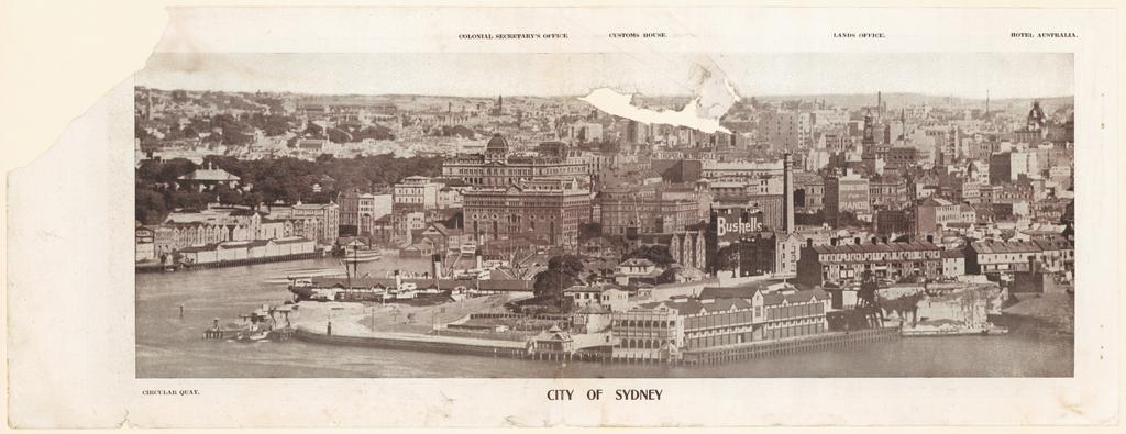 | Keywords: archives state records nsw staterecordsnsw newsouthwales blackandwhite city monochrome black and white Title: City of sydney - Circular Quay, Colonial Secretary's Office, Custom's House, Lands Office, Hotel Australia  Dated: c.1915 Digital ID: NRS20499_a050_000005 Series: NRS 20499 Most up-to-date Sydney panoramic views Rights: No known copyright restrictions  www.records.nsw.gov.au/about-us/rights-and-permissions  We'd love to hear from you if you use our photos/documents.  Many other photos in our collection are available to view and browse on our website using Photo Investigator. Title: City of sydney - Circular Quay, Colonial Secretary's Office, Custom's House, Lands Office, Hotel Australia  Dated: c.1915 Digital ID: NRS20499_a050_000005 Series: NRS 20499 Most up-to-date Sydney panoramic views Rights: No known copyright restrictions  www.records.nsw.gov.au/about-us/rights-and-permissions  We'd love to hear from you if you use our photos/documents.  Many other photos in our collection are available to view and browse on our website using Photo Investigator. |