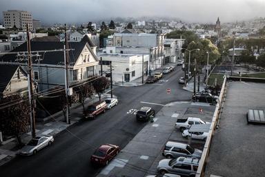 Keywords: city urban street houses residential area cars parking concrete asphalt cityscape buildings foggy cloudy weather town