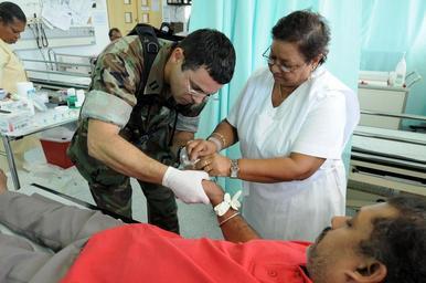 Keywords: Civic assistance mission at Couva District Health Facility DVIDS126486.jpg en Lt Hector Acevedo a physician embarked aboard the amphibious assault ship USS Kearsarge works with a Trinidadian nurse to give a patient an intravenous line at a local health facility during the humanitarian/civic assistance mission Continuing Promise 2008 Kearsarge is the primary platform for the Caribbean phase of CP an equal-partnership mission involving the United States Canada the Netherlands Brazil Nicaragua Colombia Dominican Republic Trinidad and Tobago and Guyana 2008-10-28 Petty Officer 2nd Class William Parker https //www dvidshub net/image/126486 081028-N-+++++-183 2008-11-05 03 56 COUVA TT PD-USGov-Military-Navy USS Kearsarge LHD-3 Images from DoD uploaded by Fæ |