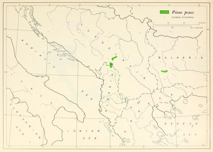 | Keywords: CL-10 Pinus peuce range map.png en Map 10 Pinus peuce distribution 1966-02 http //www biodiversitylibrary org/bibliography/66393 /summary Geographic distribution of the pines of the world Miscellaneous publication no 991 U S Department of Agriculture Forest Service Washington D C February 1966 William B Critchfield Elbert L Little Jr U S Department of Agriculture Forest Service PD-USGov Uploaded with UploadWizard Geographic Distribution of the Pines of the World Pinus peuce | ||||
