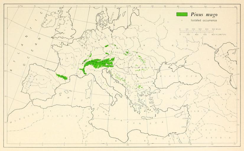 | Keywords: CL-29 Pinus mugo range map.png en Map 29 Pinus mugo distribution 1966-02 http //www biodiversitylibrary org/bibliography/66393 /summary Geographic distribution of the pines of the world Miscellaneous publication no 991 U S Department of Agriculture Forest Service Washington D C February 1966 William B Critchfield Elbert L Little Jr U S Department of Agriculture Forest Service PD-USGov Geographic Distribution of the Pines of the World Uploaded with UploadWizard Pinus mugo | ||||