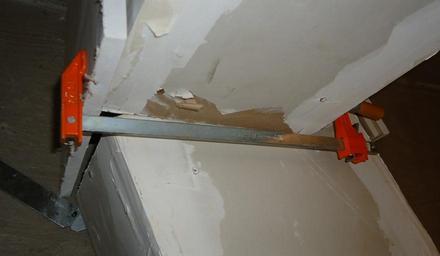 | Keywords: Clamp used to secure sheetrock to free hands to drill.jpg en A handyman project to enclose PVC drain pipes in a 12 foot-high garage ceiling Building regulations require at least 1 of firecode sheetrock protecting the pipes to prevent a possible fire from spreading A clamp holds sheetrock in place prior to drilling screws to secure it 2012-07-04 own Tomwsulcer cc-zero Uploaded with UploadWizard Construction tools | ||||