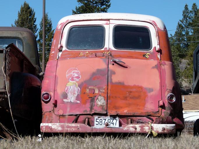 Keywords: classic car van transporter old red rusty car vintage aged antique weathered metal material damaged structure abandoned old-timer transportation history american build