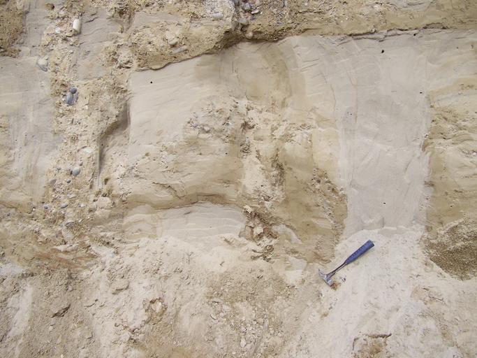 Keywords: Clastic dikes.JPG en Clastic dykes in recent late Pleistocene sedimentary strata Left an extensional crack formed in permafrost soil filled with gravel Right a sand dyke an escape structure formed by liquefaction of sand underneath a clay layer The sand bursts through the clay hydrofracture to form a clastic dyke The stress was due to an overlying advancing glacier during the last glacial maximum LGM about 25 000 years ago The dykes are cut off by an erosional unconformity covered by the basal till of the glacier Location quarry at Finsterhennen Switzerland own Woudloper 2007-09 Soft sediment deformation Sedimentary rocks Finsterhennen Geology of Switzerland Clastic dikes in Switzerland Rocks in Switzerland |