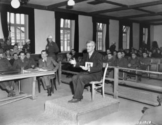 | Keywords: Claus Karl Schilling.jpeg en Dr Klaus Karl Schilling a physician who infected over one thousand prisoners with malaria in his experiments at the Dachau camp defends himself at the trial of former camp personnel and prisoners from Dachau USHMM courtesy of National Archives and Records Administration College Park Photograph 82887 Gasiewicz 1945-12-07 Copyright Public Domain Dr Klaus Karl Schilling a physician who infected over one thousand prisoners with malaria in his experiments at the Dachau camp defends himself at the trial of former camp personnel and prisoners from Dachau In his appeal in English after cross examination Schilling explained I have worked out this great labor It would be really a terrible loss if I could not finish this work I don't ask you as a court I ask you personally to do what you can; to do what you can to help me that I may finish this report I need only a table and a chair and a typewriter It would be an enormous help for science for my colleagues and a good part to rehabilitate myself His voice then broke and he cried The Dachau concentration camp trial opened on November 2 1945 in Dachau Germany Forty individuals who had participated in the operation of the Dachau concentration camp were charged with the murder and mistreatment of foreign nationals imprisoned there Among those charged were Martin Gottfried Weiss the camp commandant from 1942-1943; Dr Klaus Karl Schilling an SS physician who was brought to Dachau to find a method of immunizing people against malaria; and three former prisoners The trial lasted from November 15 to December 13 1945 with seventy witnesses called for the prosecution and fifty witnesses called for the defense All forty defendants were found guilty with thirty-six being sentenced to death by hanging including Weiss and Schilling one sentenced to hard labor for life and three sentenced to hard labor for ten years A few of the sentences were reduced after a review board determined the defendants were involved to a lesser degree than originally believed but most were upheld Those sentenced to death were hanged on May 28-29 1946 at Dachau PD-USGov Klaus Karl Schilling Dachau trial |