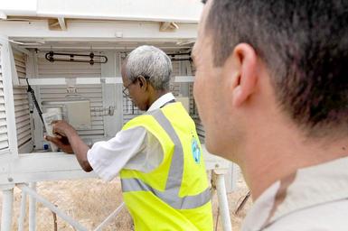 | Keywords: Clear Skies Forecasted, CJTF-HOA Meteorologists Share Technology With Djibouti DVIDS202532.jpg en Mr Said Darar chief of climatologic data for Djibouti shows U S Navy Lt Cmdr Ricardo Trevino weather forecasting instruments at the Ambouli International Airport in Djibouti Sept 5 Trevino head of Combined Joint Task Force-Horn of Africa's Meteorological and Oceanographic Department and a native of Bayamon Puerto Rico was at the airport to install a high-frequency line-of-sight antenna that will allow Djiboutian weather forecasters to receive a steady stream of information from CJTF-HOA's AN/TMQ-53 Tactical Meteorological Observing System <br>Unit Combined Joint Task Force - Horn of Africa 2009-09-05 Petty Officer 1st Class Jonathan Kulp https //www dvidshub net/image/202532/clear-skies-forecasted-cjtf-hoa-meteorologists-share-technology-with-djibouti 090905-N-+++++-022 2009-09-09 13 00 DJIBOUTI DJ PD-USGov-Military-Navy Combined Joint Task Force - Horn of Africa Images from DoD uploaded by Fæ |
