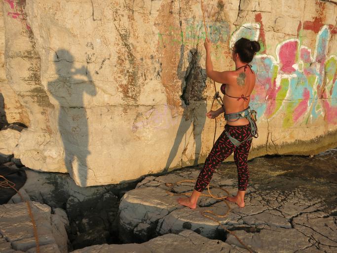 Keywords: cliff stone shadows girls sports summer rock climbing graffiti