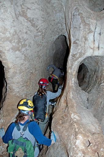 Keywords: Cavers climb up through a slotted passage. (NPS Photo by Dale Pate) nps climbing cave cavers