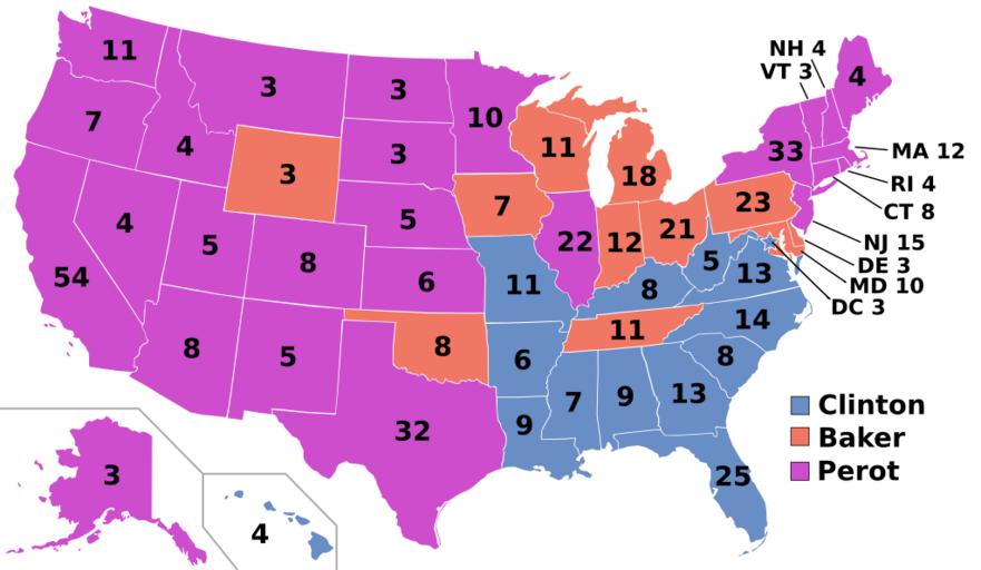 | Keywords: Clinton vs. Baker vs. Perot.svg en Hypothetical 1992 U S Presidential election map pitting Bill Clinton against Howard Baker and Ross Perot File ElectoralCollege1992 svg MB298 2016-12-09 SVG maps by MB298 Fictitious U S presidential election maps |