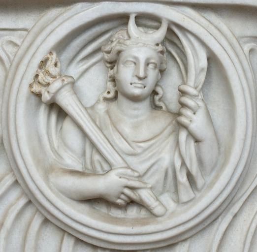 | Keywords: Clipeus Selene Terme.jpg  Bust of Selene in a clipeus detail from a strigillated lenos sarcophagus Roman artwork Buste de Séléné dans un clipeus détail d'un sarcophage à lenos Œuvre romaine Busto di Selene dentro clipeo dettaglio di uno sarcofago strigilato a lenos Opera romana early other date century 3 AD marble white Museum Terme di Diocleziano Cloister object history From Tomb D in Via Belluzzo Rome Provenance tombe D Via Belluzzo Rome Rinvenuto a Roma via Belluzzo tomba D credit line accession number Marie-Lan Nguyen 2006 other versions Selene in ancient Roman art Ancient Roman reliefs in Rome Museo delle Terme Ancient Roman reliefs in the Museo delle Terme di Diocleziano Rome Ancient Roman sarcophagi in Rome Terme 3rd-century sarcophagi Rome Round reliefs in Rome Terme Torches in art Luna mythology Women with a crescent on their head |