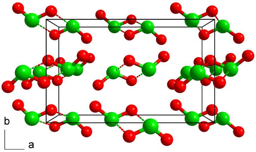 | Keywords: ClO2 cryst struct.png en Crystal structure of chlorine dioxide ClO<sub>2</sub> central projection view along 001 de Kristallstruktur von Chlordioxid ClO<sub>2</sub> Zentralperspektivische Ansicht mit Blick entlang 001 own Data source 10 1021/ic00049a006 Solid State 2010-05-05 Chlorine dioxide |