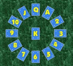 Keywords: Clock Solitaire.JPG This is a diagram of the solitaire game of Clock Solitaire based on a simulated layout The image is made in Microsoft Powerpoint and the cards used were based on the SVG Playing Cards own 2006-05-03 Nanami Kamimura I made this myself you can download it as long as you like Solitaire
