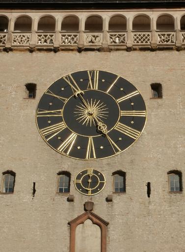 Keywords: clock wall altpoertel speyer time hour minute old round facade historic exterior closeup architecture detail dial decor