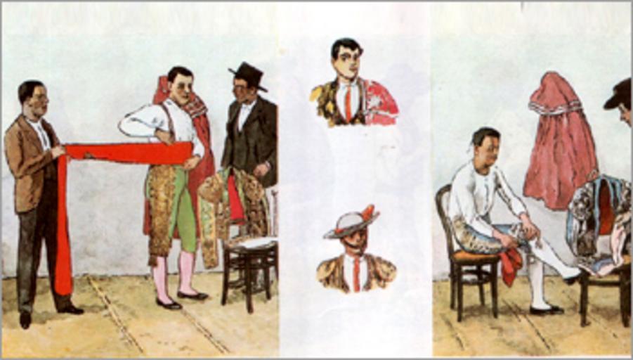 | Keywords: Clothing of Spain Table155-3.jpg Clothing of Spain Corrida 1-3 Повязывание шелкового кушака 4 атадо 5 Пикадо 6 Одевание то е о а стене - плащ для боя а стуле - на ядная ку тка History of costume http //silveromsk virtbox ru/moda/index152-2 html century 19 anonimous PD-Art Clothing of Spain Files uploaded by Shakko from various sources Bullfighting costumes Belts in art |