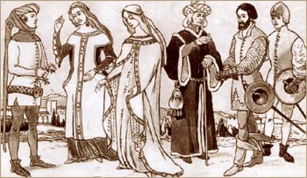 MAKE A MEME View Large Image Clothing of Spain Table62-2.jpg Clothing of Spain 13-15th c Одежда п идво ных 1 Человек благо одного звания ок 1375 г Сине-белая шляпа-тю бан; к асный капюшон с ...