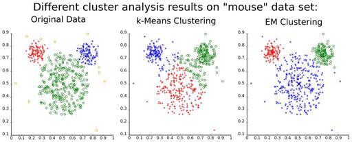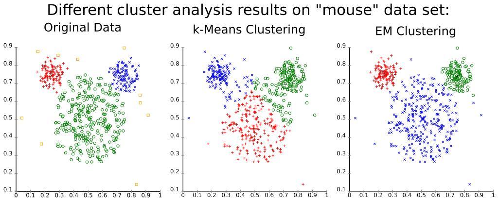 | Keywords: ClusterAnalysis Mouse.svg  Cluster analysis performed on an artificial dataset Mouse similar to a well-known comic figure comparing k means and EM clustering results The tendency of k-Means to produce clusters of the same extends produces bad results while the Gaussian nature of the data is well recognized by EM The visualization was generated using ELKI Clusteranalyse auf einem künstlichen Datensatz Maus ähnlich einer bekannten Comic-Figur mit den Algorithmen k-Means und EM Die Tendenz von k-Means cluster gleicher räumlicher Ausdehnung zu produzieren führt zu einem schlechten Ergebnis Der aus Normalverteilungen bestehende Datensatz ist dagegen ideal für EM das die Daten mit Normalverteilungen zu modellieren versucht Visualisiert mit ELKI own Chire 2010-10-12 Other fields ELKI + Cluster analysis |