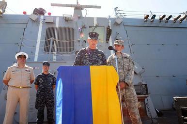 | Keywords: Cmdr. David Bretz, USS Jason Dunham and Denis Berezovsky 2012.jpg en Cmdr David Bretz commanding officer of guided-missile destroyer USS Jason Dunham speaks to Ukrainian media aboard the ship during Exercise Sea Breeze 2012 Left Capt Denis Berezovsky Navy of Ukraine 2012-07-14 http //www eucom mil/photo/23905/cmdr-david-bretz-commanding-officer-of-guided-missile-destroyer-uss-jason-dunha United States European Command U S Navy photo by MC3 Caitlin Conroy PD-USGov-Military-Navy Denis Berezovsky Uploaded with UploadWizard USS Jason Dunham DDG-109 Navy of Ukraine |