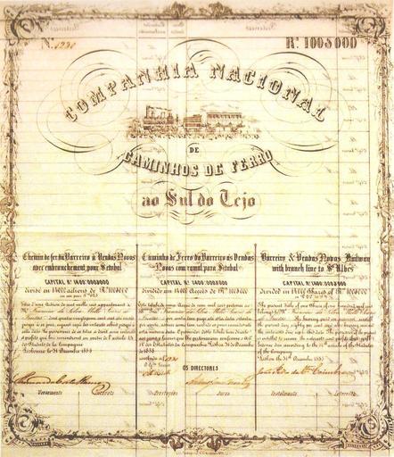 | Keywords: CNCFST Stock certificate.jpg  pt Título de acção da CNCFST - Companhia Nacional de Caminhos de Ferro ao Sul do Tejo que construiu o caminho de ferro do Barreiro a Vendas Novas com um ramal para Setúbal em Portugal en Stock certificate of the CNCFST - Companhia Nacional de Caminhos de Ferro ao Sul do Tejo Southern Tagus Railways National Company who built the railway between Barreiro and Vendas Novas with a branch to Setúbal in Portugal 1858-12-31 REIS Francisco Cardoso dos; GOMES Rosa Maria; GOMES Gilberto et al Os Caminhos de Ferro Portugueses 1856-2006 S l CP-Comboios de Portugal e Público-Comunicação Social S A 2006 238 p ISBN 989-619-078-X Companhia Nacional de Caminhos de Ferro ao Sul do Tejo other versions Custom license marker 2014 12 31 Anonymous-EU Uploaded with UploadWizard Companhia Nacional de Caminhos de Ferro ao Sul do Tejo 1858 in rail transport in Portugal Stock certificates from Portugal Os Caminhos de Ferro Portugueses 1856-2006 |