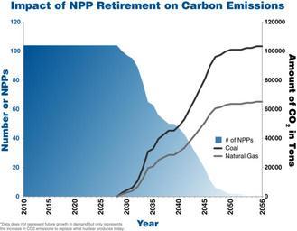 Keywords: CO2&NPPs.png In this graph NPP Nuclear Power Plant CO2 emissions if base-load electricity currently produced by nuclear power were replaced by coal or natural gas as current reactors go offline after their 60 year licenses expire references missing Note graph assumes all 104 nuclear power plants receive license extensions out to 60 years 104 also if graph does not show 60 year interval so talk about 60 year extension is confusing Own Brett R Stone and Daniel L Campbell 2009-05 Nuclear power statistics Electricity in the United States Energy statistics of the United States Atmospheric carbon dioxide
