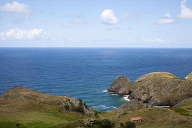 Keywords: coast shore water ocean sea seascape cliffs rocks stones hut cabin vegetation horizon lookout view clear summer calm