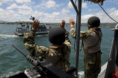 Keywords: Coastal Riverine Squadron 11, RIMPAC 2014 140716-N-WX378-093.jpg en Boatswain's Mate 2nd Class Angelique Barboa left and Master-at-Arms 2nd Class Juancarlos Casillas assigned to Coastal Riverine Squadron CORIVRON 11 warn off a patrol boat approaching a secure area as they take part in a small boat approach drill on the North Ford Island Channel next to Joint Base Pearl Harbor-Hickam during Rim of the Pacific RIMPAC Exercise 2014 Twenty-two nations 49 ships six submarines more than 200 aircraft and 25 000 personnel are participating in RIMPAC from June 26 to Aug 1 in and around the Hawaiian Islands and Southern California The world's largest international maritime exercise RIMPAC provides a unique training opportunity that helps participants foster and sustain the cooperative relationships that are critical to ensuring the safety of sea lanes and security on the world's oceans RIMPAC 2014 is the 24th exercise in the series that began in 1971 U S Navy photo by Mass Communication Specialist 2nd Class Bryan M Ilyankoff/Released 2014-07-16 Petty Officer 2nd Class Bryan Ilyankoff https //www dvidshub net/image/1452577 140716-N-WX378-093 2014-07-17 21 36 JOINT BASE PEARL HARBOR-HICKAM HI US PD-USGov-Military-Navy 2015 in Pearl Harbor People at Joint Base Pearl Harbor-Hickam RIMPAC 2014 Images from DoD uploaded by Fæ |