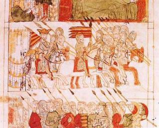 | Keywords: Codex Calixtinus (Liber Sancti Jacobi) F90 MS2631 Salamanca siglo XIV.jpg Codex Calixtinus Liber Sancti Jacobi f 90 ms 2631 Biblioteca General Histórica de la Universidad de Salamanca Representa la aparición de Santiago en sueños a Carlomagno y la decisión de éste de acudir con sus tropas a la reconquista de la península para liberar del invasor musulmán el camino de Santiago La miniatura se divide en tres registros que han de leerse de arriba hacia abajo En la parte superior Santiago se acerca al lecho de un dormido Carlomagno acostado con su corona y una cartela que cuelga del brazo del apóstol y une a ambos personajes se utiliza para comunicarle su deseo de que libere su patria de la dominación islámica A la izquierda fuera del recinto en que descansa Carlomagno añade el miniaturista la matanza de cristianos a manos de los infieles escena que le señala Santiago con su mano derecha En los dos registros siguientes se representa la salida de Aquisgrán del propio Carlomagno rodeado de sus caballeros y precedido de las tropas y de Roldán que porta el estandarte del monarca repetido al lado de Carlomagno Abajo se dispone el diálogo de los soldados Fuente de la descripción La miniatura y el grabado de la Baja Edad Media en los archivos españoles p 144 Biblioteca General Histórica de la Universidad de Salamanca siglo XIV anonimus Codex Calixtinus PD-old |